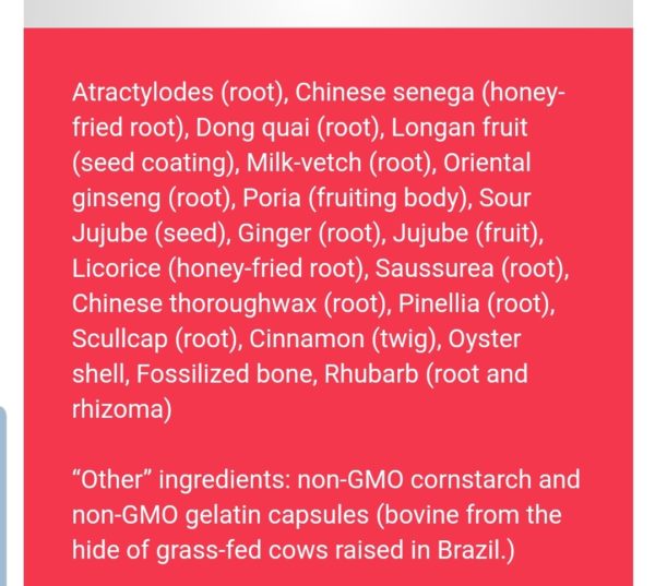 Atractylodes (root), Chinese senega (honey-fried root), Dong quai (root), Longan fruit (seed coating), Milk-vetch (root), Oriental ginseng (root), Poria (fruiting body), Sour Jujube (seed), Ginger (root), Jujube (fruit), Licorice (honey-fried root), Saussurea (root), Chinese thoroughwax (root), Pinellia (root), Scullcap (root), Cinnamon (twig), Oyster shell, Fossilized bone, Rhubarb (root and rhizome)