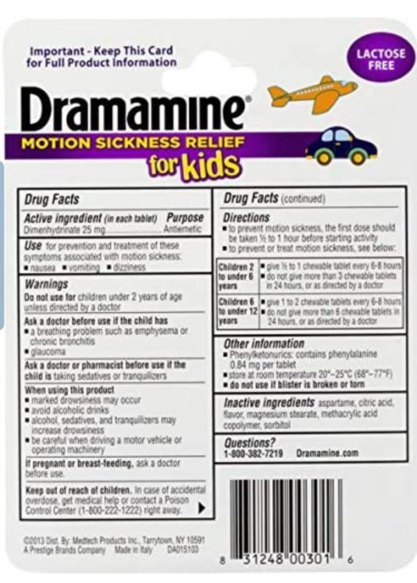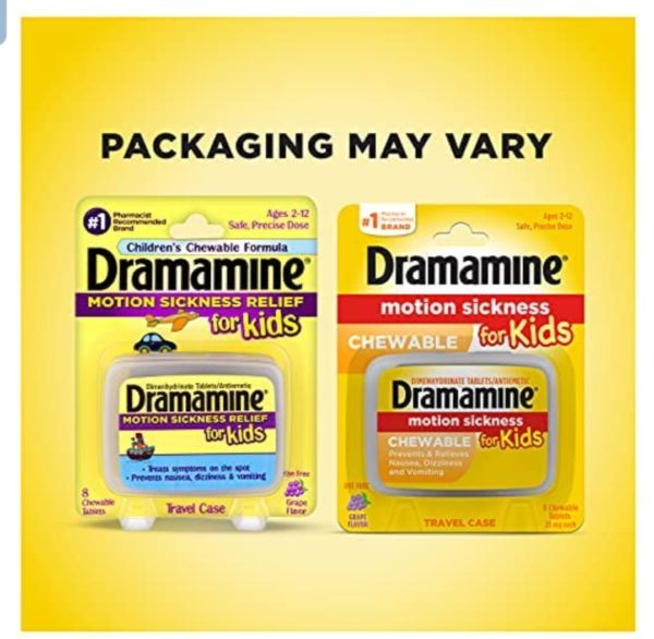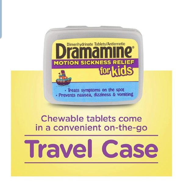 Dramamine for Kids is the only medicated motion sickness relief product formulated just for children ages 2 12 from the #1 Pharmacist Recommended brand. It treats symptoms on the spot, preventing nausea, dizziness and vomiting. Dramamine for Kids has a safe, precise dose in a fun, chewable grape flavor and it comes in a convenient, portable travel case ideal for car rides, boat rides, and airplane trips! Always bring Dramamine with you! You don't want to be caught in the air, on the water, or on the road without Dramamine. Thirty three percent of all kids ages 2 12 suffer from motion sickness. Dramamine is the only leading brand to have developed a solution formulated specifically for children 2 years and older, not only preventing nausea, vomiting and dizziness but also treating symptoms on the spot. Here are some tips: 1. If your child is prone to motion sickness or if he/she unexpectedly begins to feel motion sick during a trip, tell him or her to look out at the horizon and focus on a non moving object. An older child might feel better sitting in the front seat, too. 2. Get fresh air. Sit outdoors with your child (on a boat), or open a window (in a car or bus) when possible. The fresh air helps distract from those oogly booglies. 3. The last thing a parent wants to hear from a child is, “I’m gonna be sick!” This is why one of the most important items to pack when traveling with children is a bag or bucket. Be sure to keep it close at hand, too. It won’t do you any good buried beneath a pile of suitcases in the trunk. 4. Ginger is a spice renowned for its ability to soothe an upset tummy. Pack a few ginger infused, low sugar candies in your day pack as a sweet distraction for your little one during your journey. 5. Use a distraction. Take your child’s mind off the motion sickness by playing music (on headphones on a plane). Anything that requires too much thinking, like playing a game or reading books, probably will just make things worse. 6. Pack some protein. Avoid giving your child too many sugary treats, which can make them shaky. Don’t overeat either. Instead, stick to small, protein packed snacks like a handful of nuts, a protein bar, or peanut butter crackers. Not only is Dramamine the most trusted over the counter treatment for motion sickness, it is the #1 Pharmacist Recommended brand to both prevent and treat the condition.