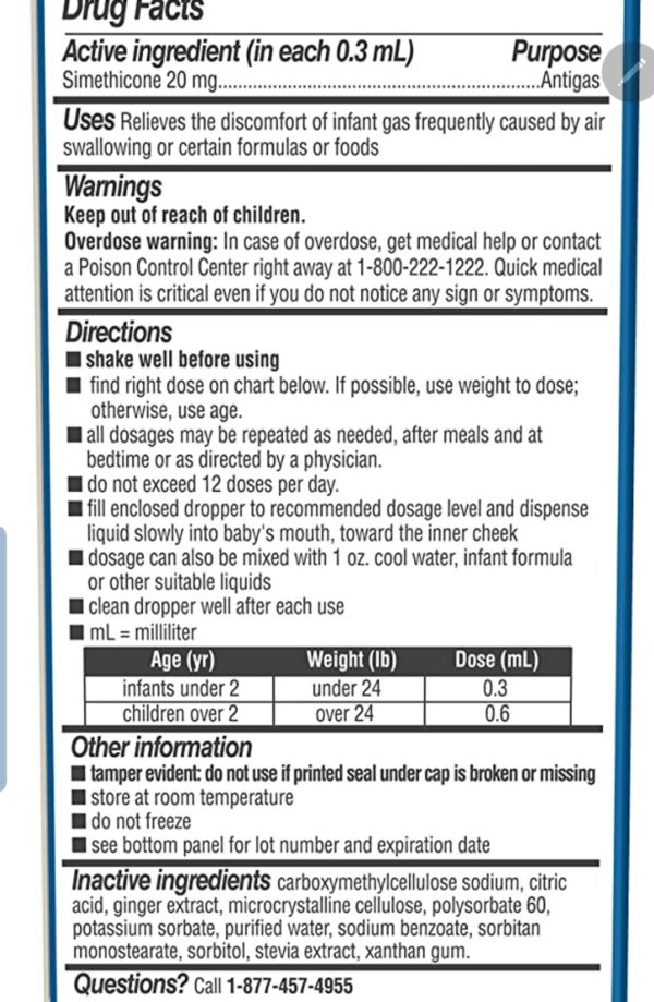 Shake well before using. Fill enclosed dropper to recommended dosage level and dispense liquid slowly into baby’s mouth, toward inner cheek. If possible, use weight dosage; otherwise use age. All dosages may be repeated as needed, after meals and at bedtime or as directed by a physician. Do not exceed 12 doses per day. Dosage can also be mixed with 1 oz. cool water, infant formula or other suitable liquids. Clean dropper after each use. Recommended dosage: Infants under 2 (or under 24 lbs): 0.3 mL Children over 2 (or over 24 lbs
