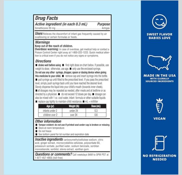 Shake well before using. Fill enclosed dropper to recommended dosage level and dispense liquid slowly into baby’s mouth, toward inner cheek. If possible, use weight dosage; otherwise use age. All dosages may be repeated as needed, after meals and at bedtime or as directed by a physician. Do not exceed 12 doses per day. Dosage can also be mixed with 1 oz. cool water, infant formula or other suitable liquids. Clean dropper after each use. Recommended dosage: Infants under 2 (or under 24 lbs): 0.3 mL Children over 2 (or over 24 lbs): 0.6 mL